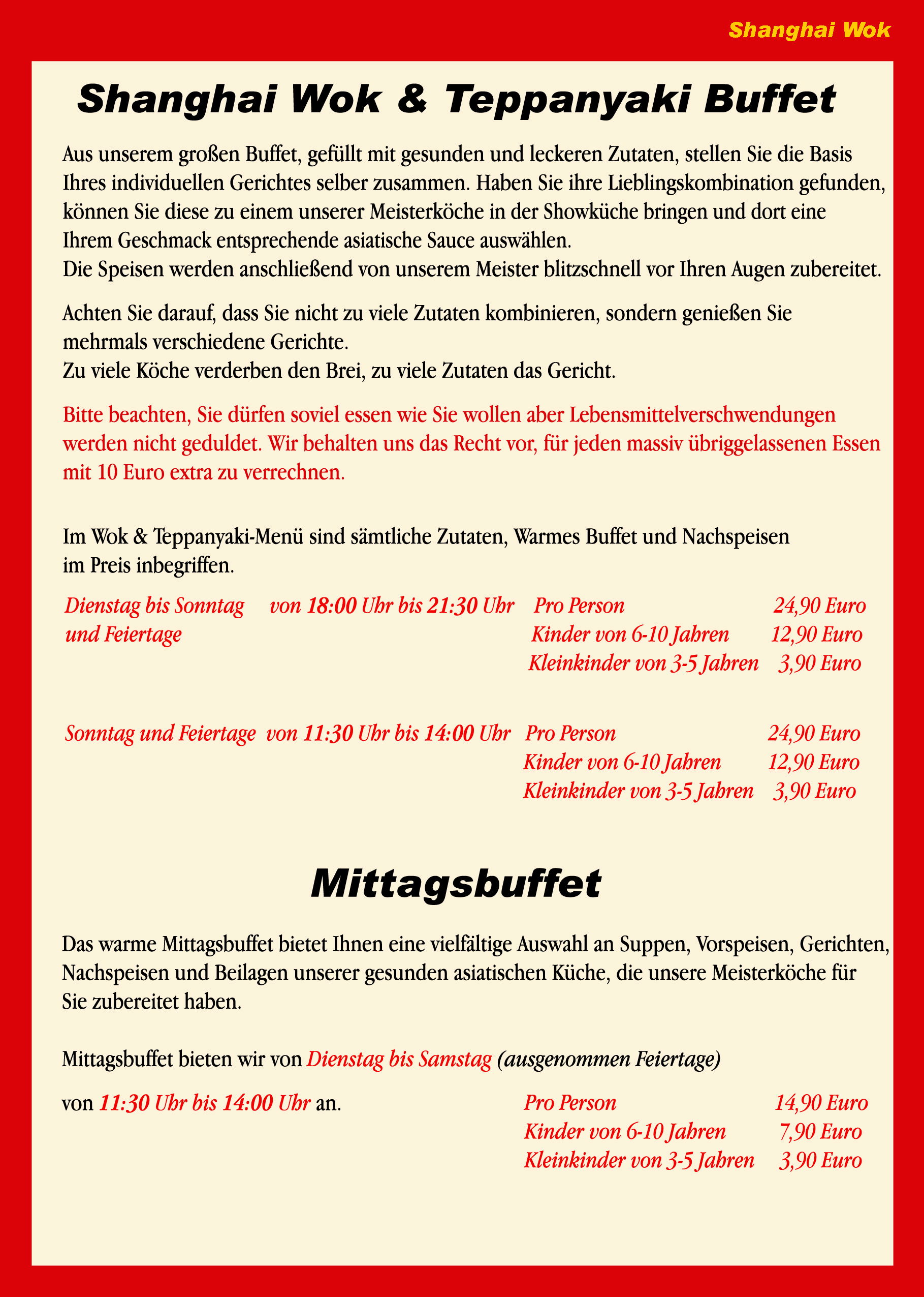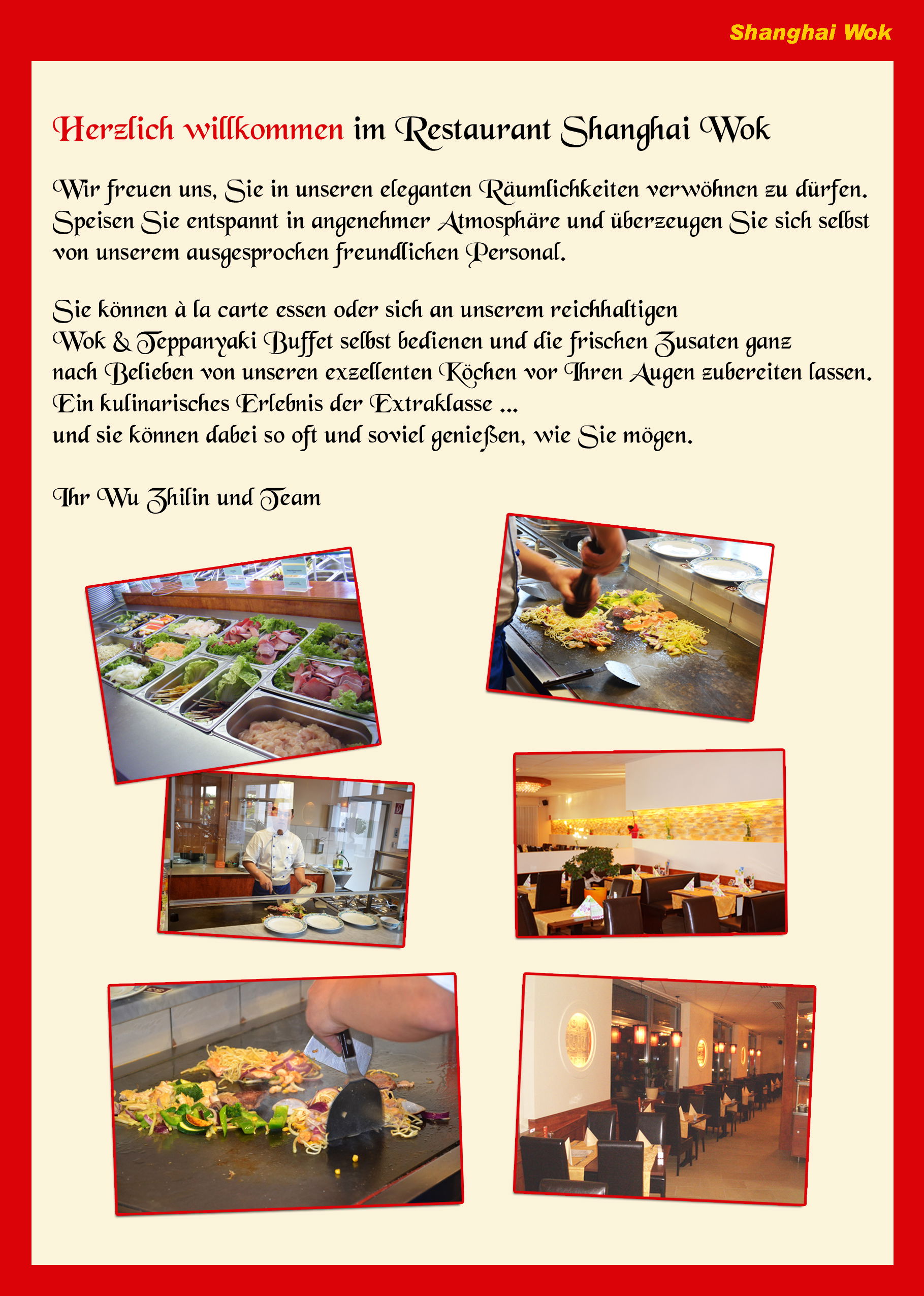 Sie können à la carte essen oder sich an unserem reichhaltigen Wok & Teppanyaki Buffet selbst bedienen und die frischen Zutaten ganz nach Belieben von unseren exzellenten Köchen vor Ihren Augen zubereiten lassen. Ein kulinarisches Erlebnis der Extraklasse ... und Sie können dabei so oft und soviel genießen, wie Sie mögen.
